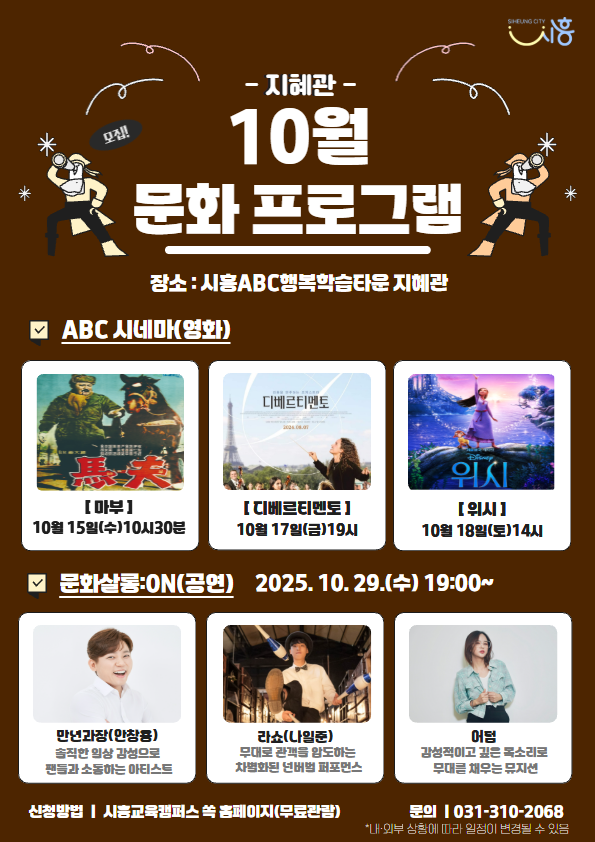 [문화공연] 지혜관 문화살롱 : ON 일시 : 10. 29. (수) 19:00 장소 : 시흥ABC행복학습타운 지혜관 출연 : 만년과장(안창용), 라쇼(나일준), 어텀