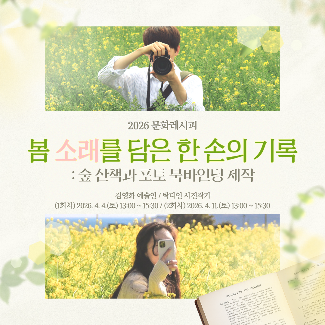 * 본 워크숍은 2회차로 진행됩니다. * [2026 문화레시피 - 워크숍] 봄 소래를 담은 한 손의 기록 : 숲 산책과 포토 북바인딩 제작 ㆍ세부내용 : 미니 포토북 만들기 (출사&북바인딩) ㆍ일정 : (1회차) 2026. 4. 4.(토) 13:00 ~ 15:30 / (2회차) 2026. 4. 11.(토) 13:00 ~ 15:30 ㆍ예술인 : 김영화 / 사진작가 : 탁다인 ㆍ대상 : 성인 / 선착순 10명 ※ 2026 문화레시피란? 시흥 예술인이 지혜관 공간을 활용하여 시민과 다양한 문화·예술 활동을 할 수 있도록 지원하는 사업입니다. ※