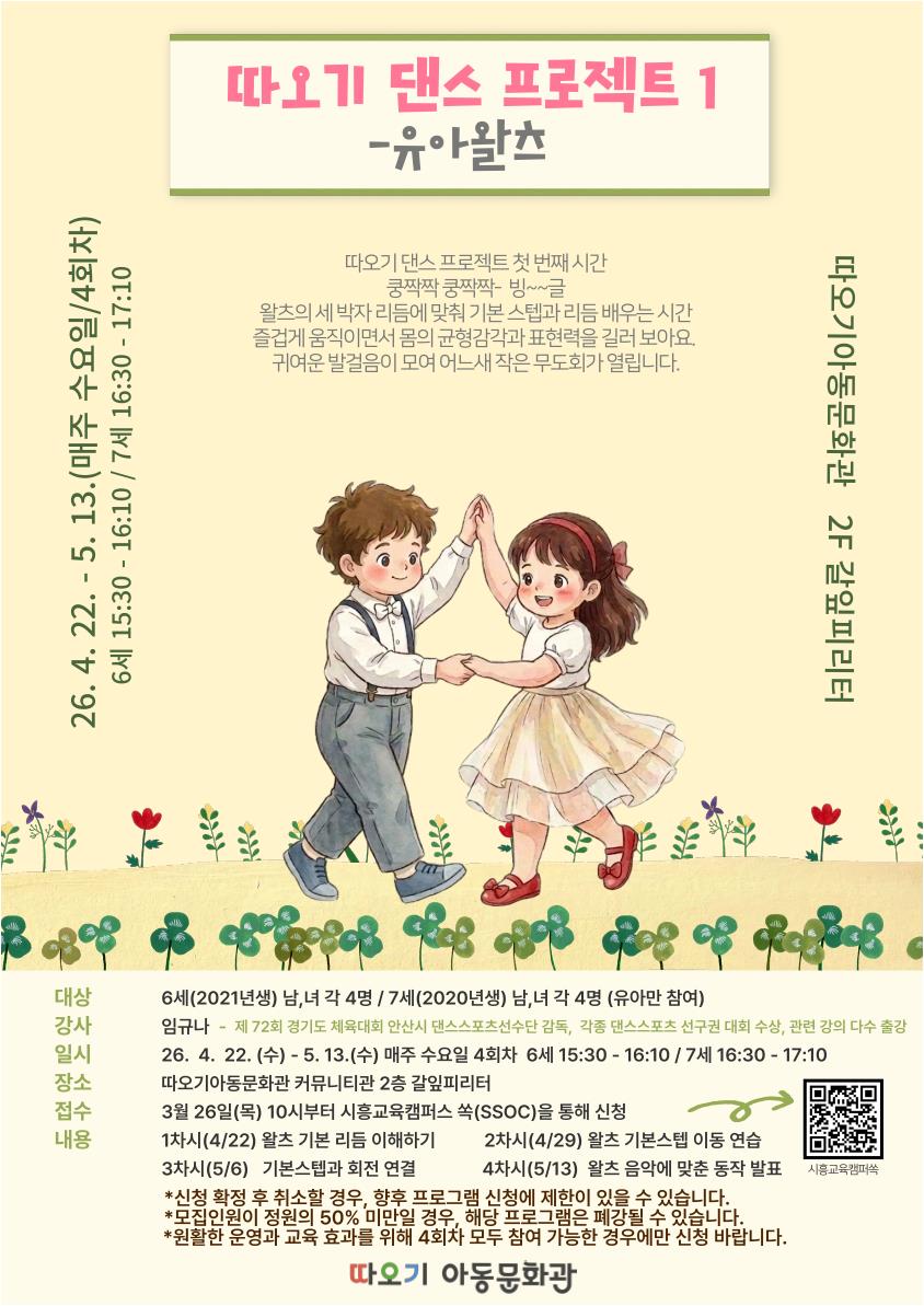 따오기 댄스 프로젝트 첫번째 시간 쿵짝짝 쿵짝짝- 빙~~글 왈츠의 세 박자 리듬에 맞춰 기본 스텝과 리듬을 배우는 시간 즐겁게 움직이면서 몸의 균형감각과 표현력을 길러 보아요. 귀여운 발걸음이 모여 어느새 작은 무도회가 열립니다. 대상 : 6세(2021년생) 남,녀 각4명/ 7세(2020년생) 남,녀 각4명(유아만 참여하는 수업입니다.) 일시 : 26. 4. 22.(수) - 5. 13.(수) 매주 수요일 4회차 6세 15:30 -16:10 / 7세 16:30 - 17:10 내용 : 유아왈츠 장소 : 따오기아동문화관 커뮤니티관 2층 갈잎피리터(동서로 902-20) *자세한 사항은 아래 블로그를 참조해 주세요. https://blog.naver.com/taoki-siheung/224228006334