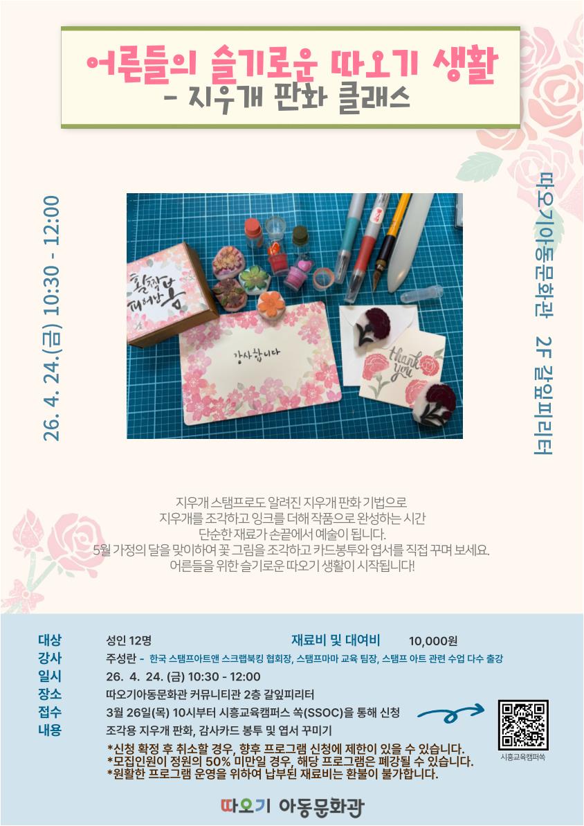 지우개 스탬프로도 알려진 지우개 판화 기법으로 지우개를 조각하고 잉크를 더해 작품으로 완성하는 시간 단순한 재료가 손끝에서 예술이 됩니다. 5월 가정의 달을 맞이하여 꽃 그림을 조각하고 카드봉투와 엽서를 직접 꾸며 보세요. 어른들을 위한 슬기로운 따오기 생활이 시작됩니다. 대상 : 성인 12명 일시 : 26. 4. 24. (금) 10:30 - 12:00 내용 : 조각용 지우개 판화, 감사카드 봉투 및 엽서 꾸미기 장소 : 따오기아동문화관 커뮤니티관 2층 갈잎피리터(동서로 902-20) 재료비 및 대여비 : 10,000원 *자세한 사항은 아래 블로그를 참조해 주세요. https://blog.naver.com/taoki-siheung/224228006334